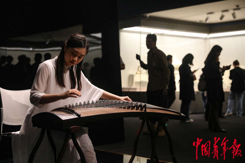 10月24日,北京,清华大学艺术博物馆,“礼运东方:山东古代文明精粹”特展上,一名来自中央音乐学院的学生在现场演奏古筝。中青报·中青网记者 孔斯琪/摄