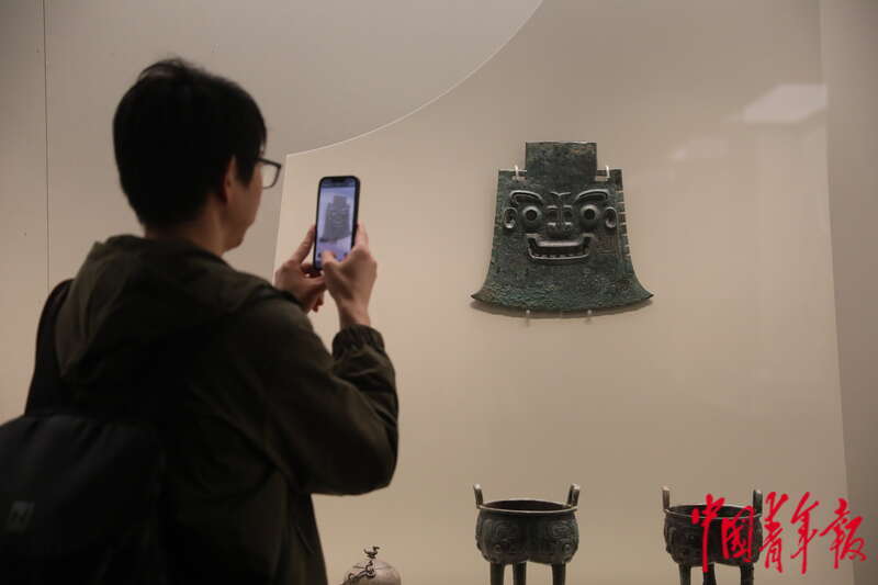10月24日,北京,清华大学艺术博物馆,“礼运东方:山东古代文明精粹”特展上,参观者在拍摄国家一级文物商代亚醜钺。中青报·中青网记者 孔斯琪/摄