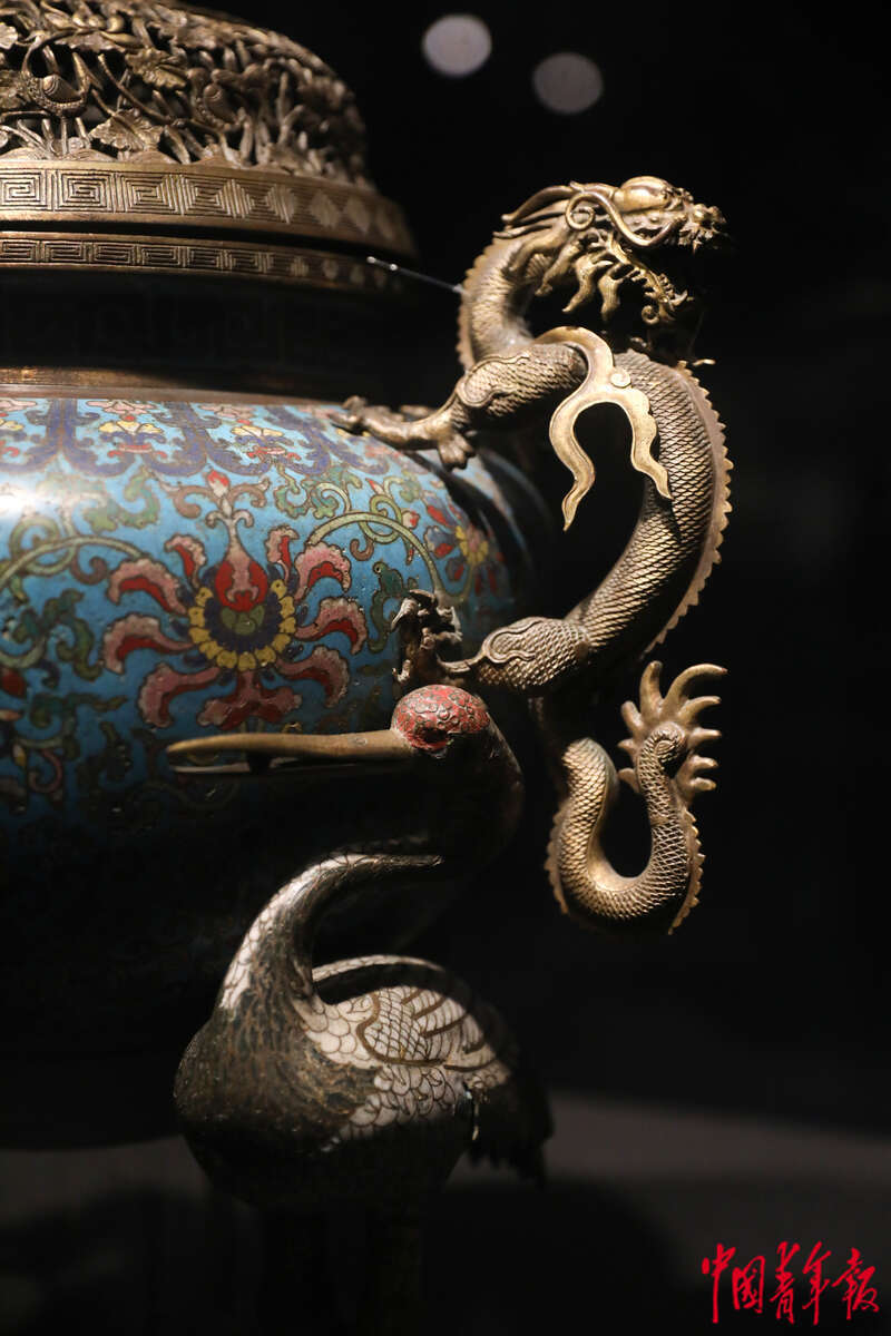 10月24日,北京,清华大学艺术博物馆,“礼运东方:山东古代文明精粹”特展上,国家一级文物缠枝宝相花掐丝珐琅鹤足炉局部。据介绍,展览共分“日出初光,饰节以礼”“海岱惟青,玉礼四方”“王礼在鲁,天下久传”“俾侯于鲁,炜炜煌煌”“高山仰止,登泰观海”“称工北朝,东方微笑”“图画天地,碑传千古”七个单元。中青报·中青网记者 孔斯琪/摄
