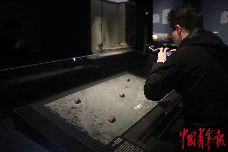 10月24日,北京,清华大学艺术博物馆,“礼运东方:山东古代文明精粹”特展上,一名参观者在拍摄一件西汉时期的矩形五钮龙纹铜镜。这只铜镜出土于淄博市大武乡窝托村西汉齐王墓陪葬坑,现藏于淄博市博物馆,是我国目前已知最大的古代矩形铜镜。作为中国首批禁止出国(境)展览的文物之一,它自1980年出土以来很少被公开展出。中青报·中青网记者 孔斯琪/摄