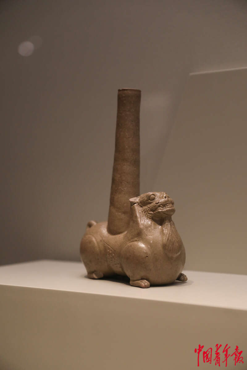 10月24日,北京,清华大学艺术博物馆,“礼运东方:山东古代文明精粹”特展上,西晋越窑青釉狮形烛台。中青报·中青网记者 孔斯琪/摄