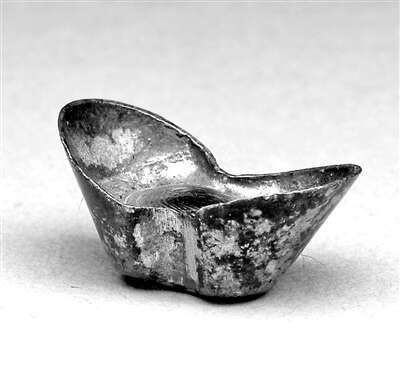当然,宋朝肯定是有白银的,少数大额交易也可能用到白银,《宋史》中就有北宋大臣斥资几千两白银买豪宅的记载。不过由于白银在宋朝并非基准货币,交易中的使用率极低,所以宋朝还没有出现明朝和清朝那样的碎银子,而是以银锭的形式出现。宋朝银锭长什么样子呢?一般是扁扁的长方体,一头略宽,一头略窄,造型很像大臣上朝用的笏板。按南宋数学教材《乘除通变算法》和元朝学术著作《通鉴释文辩误》的记载,宋朝银锭分为大、中、小三种,大银锭重50两,中银锭重23两,小银锭重12两。
