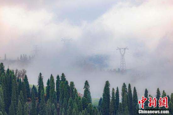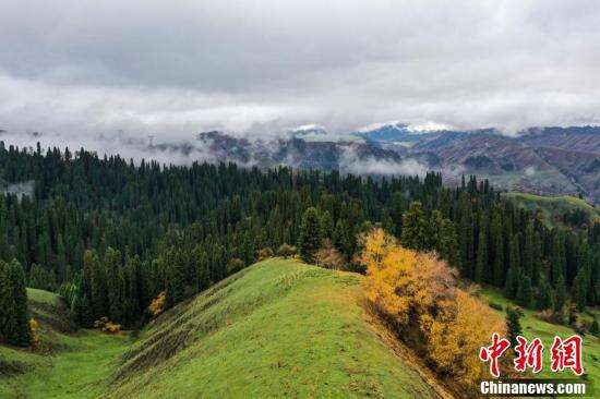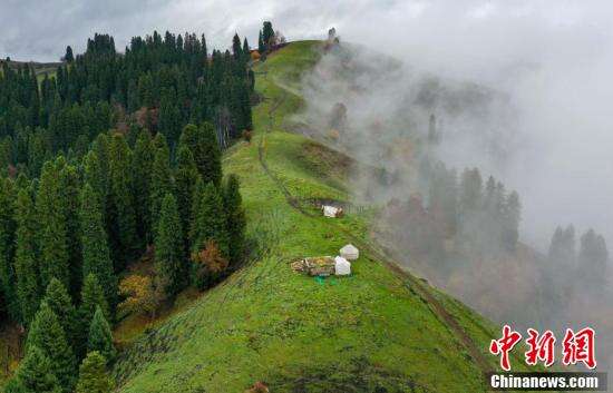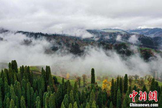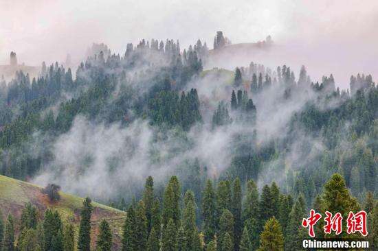 10月25日,一场秋雨过后,位于新疆西天山的萨哈景区出现变幻多端的云雾翻涌景观。一团团薄云游走在山谷、松林间,一切都若隐若现。图为山间雨后呈现出一幅云蒸雾绕的景象,宛如人间仙境。