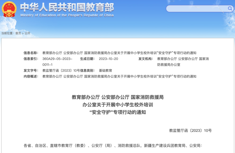 中国青年报客户端北京10月26日电(中青报·中青网记者 樊未晨)记者从教育部获悉,教育部、公安部、国家消防救援局联合部署开展全国校外培训“安全守护”专项行动,据了解,此次专项行动于2023年10月至12月集中开展,聚焦了五项重点任务。