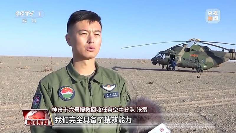 神舟十六号搜救回收任务空中分队 张雷:通过今天的训练,我们完全具备了搜救能力,能够精准高效、安全稳妥地完成好此次任务。确保舱落机降人到,为航天员保驾护航。