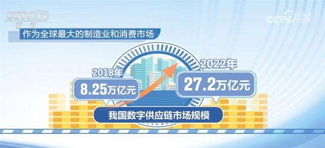 中国物流与采购联合会相关负责人介绍说,据测算,作为全球最大的制造业和消费市场,我国数字供应链市场规模从2018年的8.25万亿元增加到2022年的27.2万亿元,年复合增长率达到26.94%,2023年数字供应链市场规模将突破32万亿元。供应链的安全稳定为畅通双循环、促进经济高质量发展、提升国际竞争力提供有力支撑。