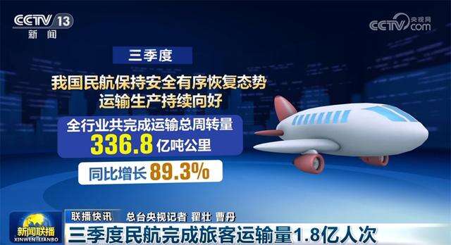 三季度,我国民航保持安全有序恢复态势,运输生产持续向好,全行业共完成运输总周转量336.8亿吨公里,同比增长89.3%;客运市场需求旺盛,全行业共完成旅客运输量1.8亿人次,同比增长108.3%,行业客运规模创季度历史新高。