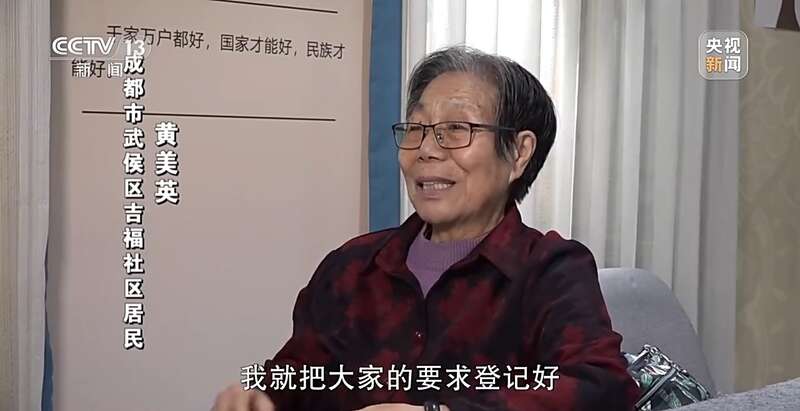 成都市武侯区吉福社区居民 黄美英:比如办老年证,我就把大家的要求登记好就给社区去反映,社区就给我把老年证办上。我就感到我还有用,不叫第二份工作,但是至少我想我还能为大家服务,我还没有到老了不能用的时候。