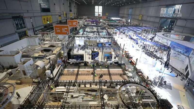 国家会展中心(上海)内部布展工作正在进行,搭建展台的工作人员也正在有序施工。