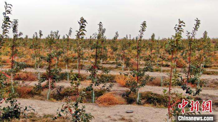 泽普县现代富民产业园负责人张国军说,现代富民产业园选用国内自主选育的抗寒、耐盐碱半矮化砧木青砧1号自根砧,作为苹果栽培的矮化砧,选择与青砧1号矮化砧亲和性好、分枝能力强、易成花、易管理的优质晚熟耐贮的黄色品种瑞雪、维纳斯黄金和红色品种秦脆搭配,选择苹果无支架矮化砧木栽培模式,苹果栽种行距4米、株距1.5米,亩栽植果树110株。