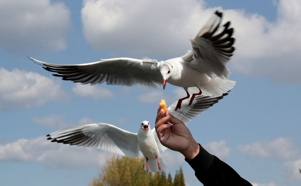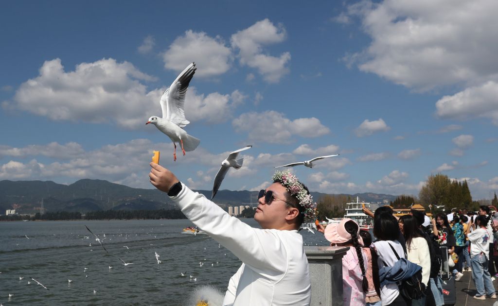 2023年10月29日,云南省昆明市,来昆明越冬红嘴鸥聚集在滇池大坝草海水域觅食,吸引大批市民游人前来观鸥喂鸥,再现人鸥和谐的热闹场景。