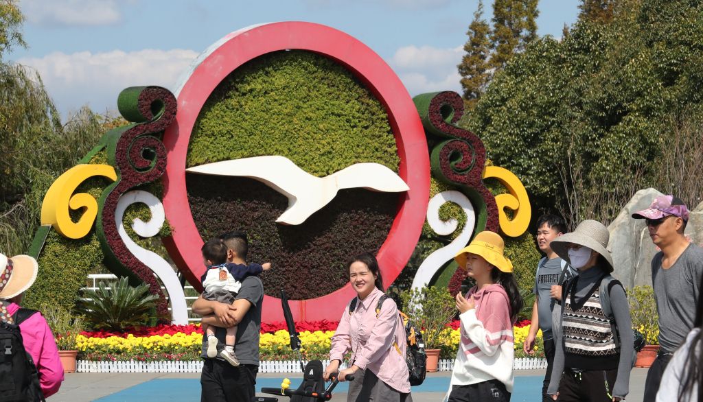 2023年10月29日,昆明,游客纷纷来滇池大坝草海水域观鸥。
