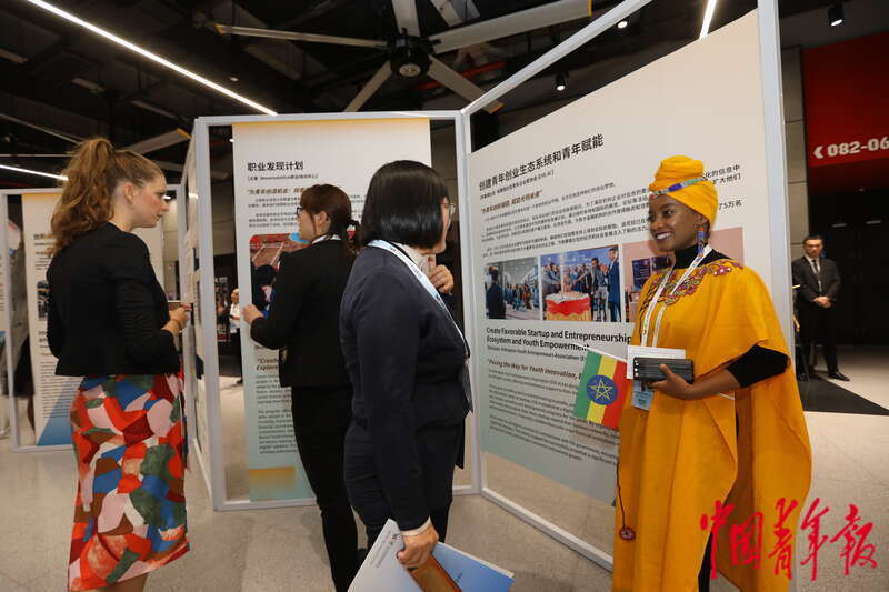 10月30日,北京首钢园,2023年世界青年发展论坛全体会议会茶歇期间,来自各国的青年代表在参观全球青年发展行动计划博览会。中青报·中青网记者 李建泉/摄