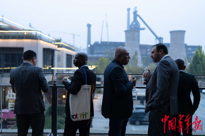 10月30日,北京首钢园,2023年世界青年发展论坛全体会议茶歇期间,来自各国的参会人员在交流。中青报·中青网记者 赵迪/摄