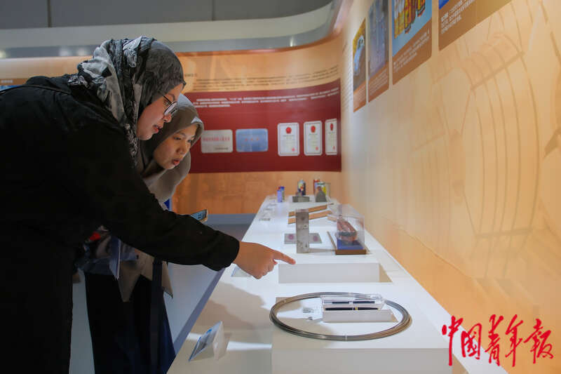 10月30日,北京,2023年世界青年发展论坛开幕式前,各国青年代表在首钢陶楼参观首钢曾生产的主要产品。田嘉硕/摄