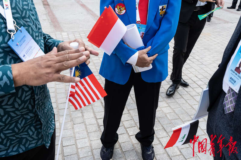 10月30日,北京首钢园,2023年世界青年发展论坛会场外,手持自己国家国旗的青年代表。中青报·中青网记者 李隽辉/摄