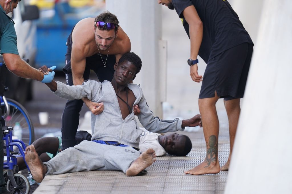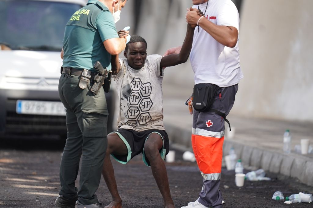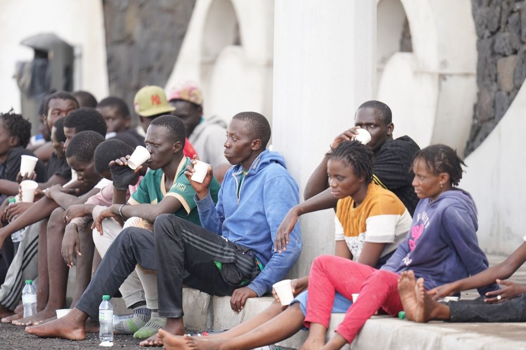 当地时间2023年10月31日,西班牙耶罗岛,一些移民在拉雷斯廷加港口被收容。第二艘卡尤科船抵达耶罗岛,船上有41人,当日移民总数达到212人。该船由国民警卫队的“Rio Tajo”巡逻队护送,Salvamento Maritimo没有必要干预。到达陆地后,他们得到了卫生队的照料。