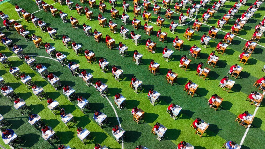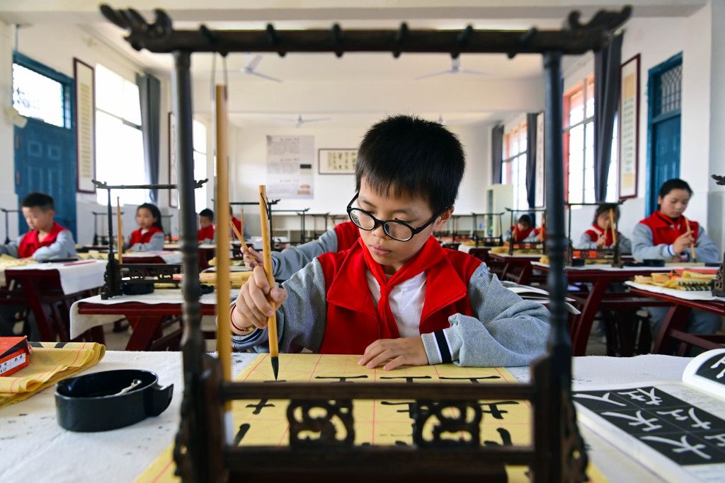 2023年11月2日,江西省宜春市,万载县双桥镇山溪小学,学生在参加汉字书写大赛硬笔项目的比赛。