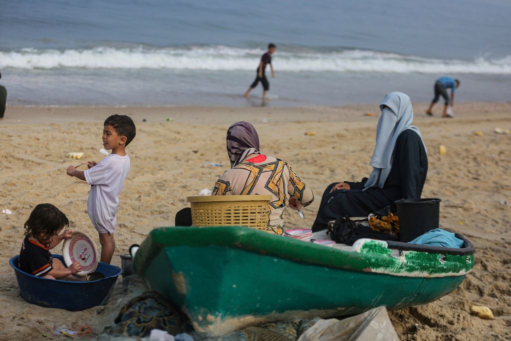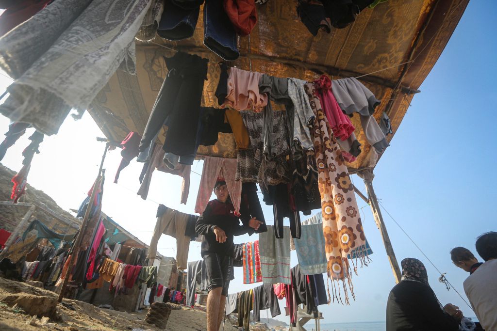 当地时间2023年11月2日,加沙地带代尔巴拉赫,由于缺水,巴勒斯坦人在海滩上用海水洗衣服、洗炊具和打扫卫生。