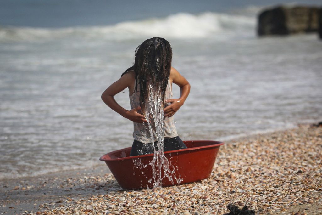 当地时间2023年11月2日,加沙地带代尔巴拉赫,由于缺水,一名巴勒斯坦女孩正在用海水进行清洁。