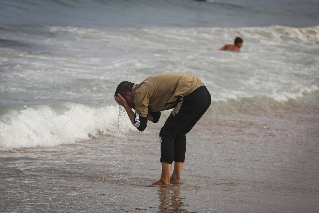 当地时间2023年11月2日,加沙地带代尔巴拉赫,由于水资源短缺,一名巴勒斯坦男子正在用海水进行清洁。