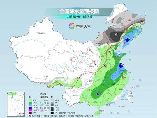 后天,内蒙古中东部、黑龙江大部、吉林西部、辽宁西部、河北北部等地部分地区有小到中雪或雨夹雪,其中,内蒙古东南部、黑龙江东北部、吉林西南部、辽宁西北部等地部分地区有大到暴雪。吉林中东部、辽宁东部、山东东部、苏皖大部、江西北部、湖北东部、湖南大部、广西北部等地部分地区有中到大雨,其中,辽宁东北部、江苏东北部等地部分地区有暴雨。
