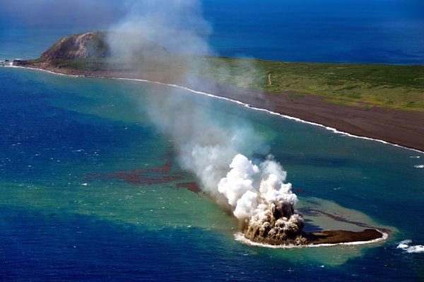 当地时间2023年11月3日,日本东京小笠原群岛,土和沙被送到离硫磺岛海岸不远的一个新小岛的上空。一座海底火山的喷发在太平洋东京以南1000多公里的小笠原岛链上形成了一个小岛。