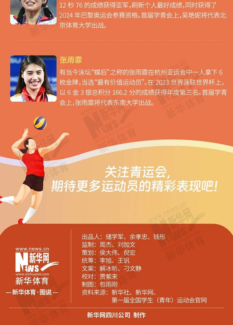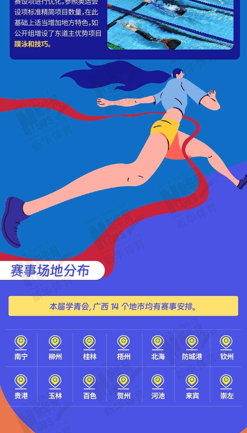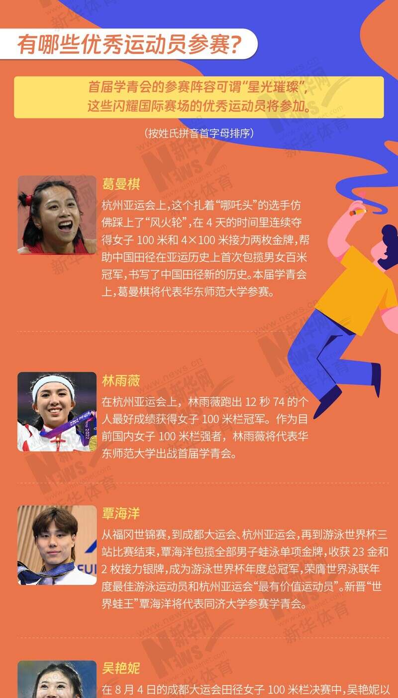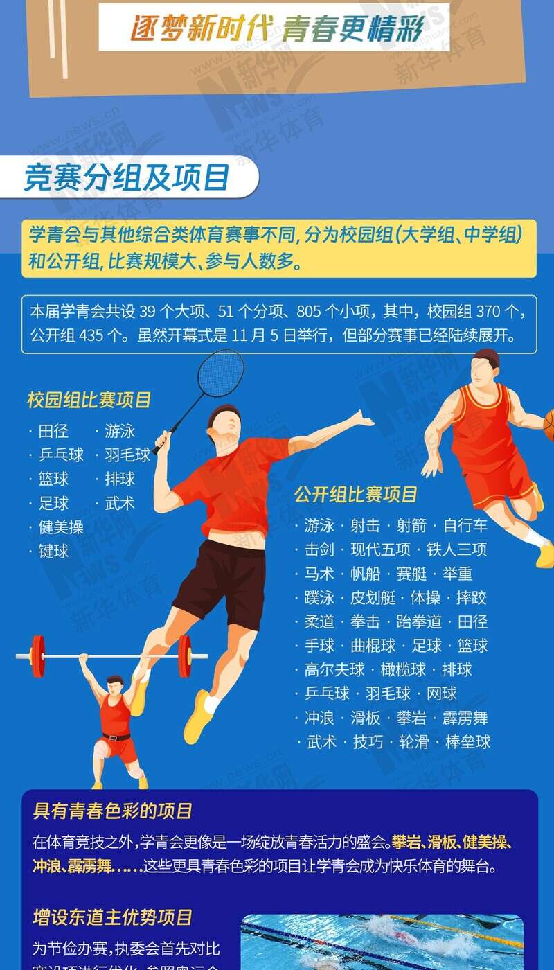 中华人民共和国第一届学生(青年)运动会(以下简称“学青会”)于2023年11月5日至15日在广西举行,这是全国青年运动会和全国学生运动会合并后的首届赛事。来自全国各地的学生青年运动健儿们共赴青春之约,在八桂大地挥洒汗水写就华章。首届学青会有哪些项目?都有哪些优秀运动员参赛?新华体育带你一图了解!