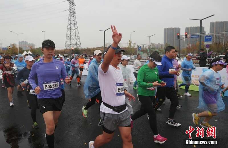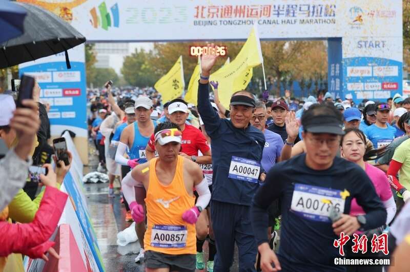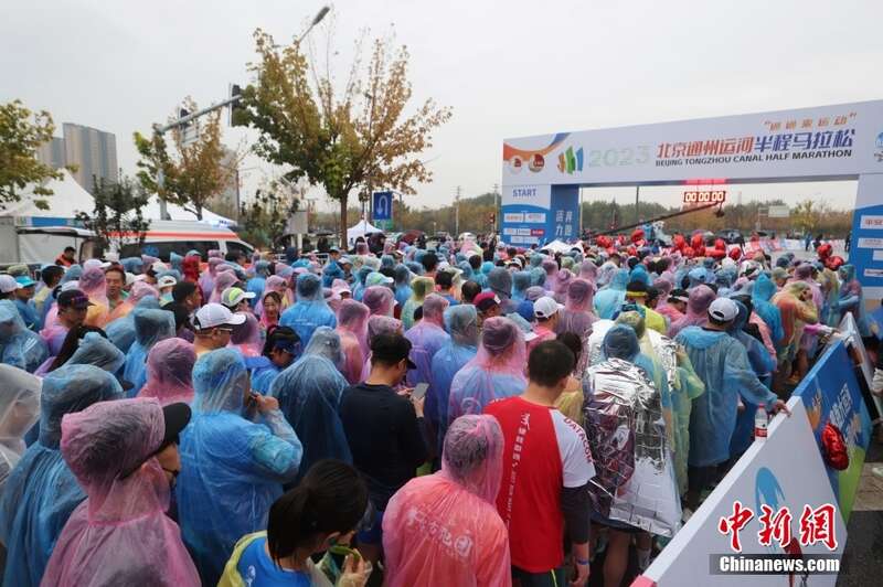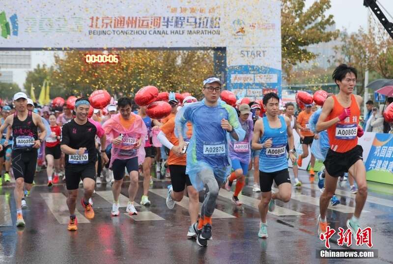 11月5日,2023北京通州运河半程马拉松在雨中鸣枪开跑。