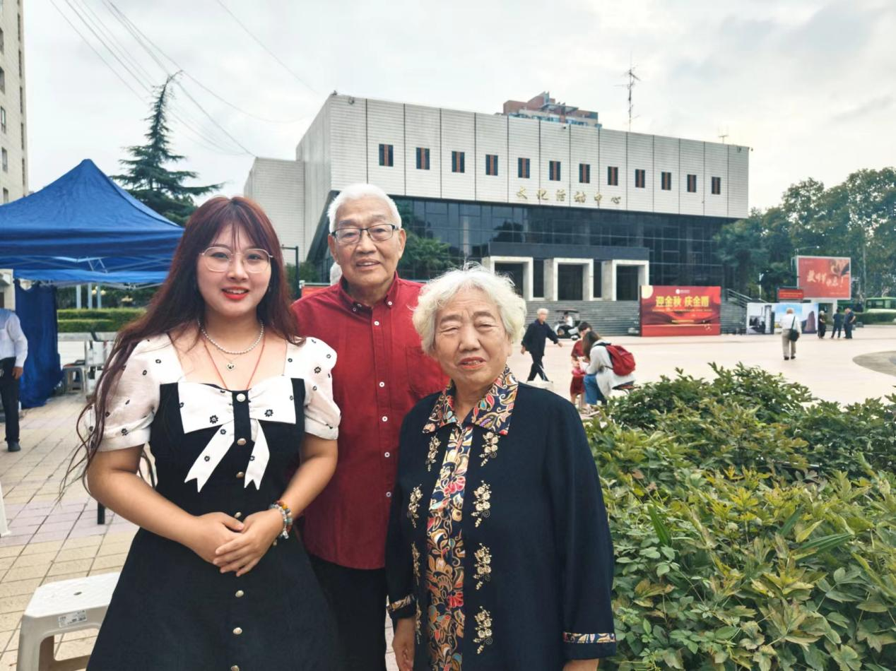 秋高气爽,晴空万里。在北校区大礼堂广场,数对金婚夫妻手拉着手站在纪念墙边合影。