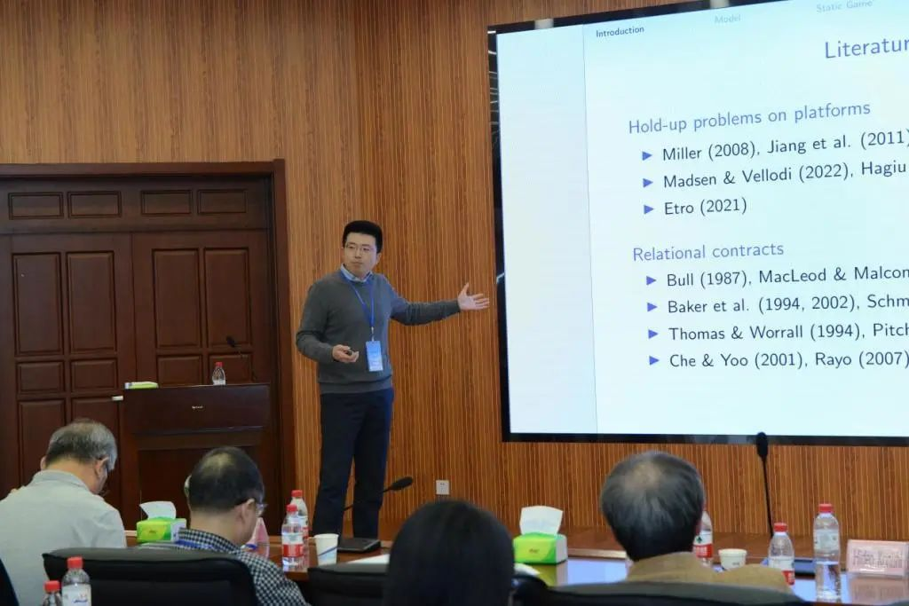 会议第二个单元为“产业组织的前沿进展”的展示,由辽宁大学李安民经济研究院助理教授郑珍龙主持。复旦大学陆卓然助理教授研究发现卖家经常面对平台仿冒产品来与他们竞争的问题,他探讨了通过平台和卖家之间的关系契约来解决此类问题的可能性。厦门大学陈德麟助理教授研究了委托人该如何同时最优地设计团队生产技术及绩效工资。这种联合设计可以为委托人带来最优性和稳健性之间的良好平衡。辽宁大学何真瑜助理教授展示了一种新的多边匹配。与传统多边匹配市场不同,买家和卖家需要通过代理人才能联系,因此,每份合同都必须有一名代理人。该研究证明了在可替代性和拒绝契约无关性的条件下,稳定匹配集是非空的。