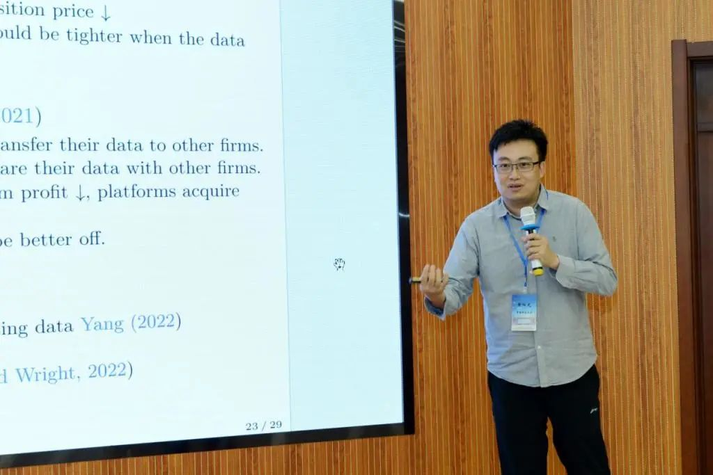 会议第六个单元为“数字经济的前沿进展”的展示,由辽宁大学张胜强教授主持。上海财经大学孟大文教授分析了社交网络上存在从众玩家和私人信息时的最优契约问题。他首先刻画了最优合同与完全信息情况的差异,然后分析了有预算约束情况下以缩小最优和次优效率差距为目标的有针对性干预问题,最后讨论了私人信息的不确定性对于分配结果和效率的影响。北京大学吴泽南副教授报告了关于多维度差异化定价与市场竞争的研究。他分析了消费者具有与品牌相关(忠诚度)以及与品牌独立(挑剔度)的两个维度的偏好的水平差异化寡头市场,发现利用所有信息的价格歧视策略或者只利用忠诚度信息的策略均可实现消费者剩余的最大化,然而只利用挑剔度信息的价格歧视策略总是带来企业利润的最大化。中南财经政法大学龚强教授就供应链中数字技术的机制与影响进行了报告。他利用博弈论模型分析了数字供应链相较于传统供应链的优势劣势,尤其考虑了不完备合约带来的影响。他区分了可验证与不可验证信息,其中只有前者可以在数字供应链的信息记录者间中达成共识。他发现,如果供应链上采用数字技术的企业数量足够多,而且记录信息的质量足够高,数字供应链所达成的共识就可以趋近于现实世界中的真实信息。在相反的情况下,企业则应通过传统技术来控制风险。