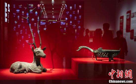 图为展陈的1970年出土于江苏徐州土山汉墓的东汉时期三足镂空铜器(右)、1965年出土于江苏涟水三里墩西汉墓的战国时期铜鹿(左)。