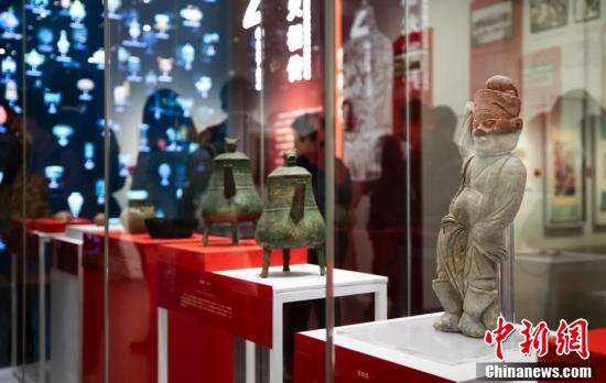 图为展陈的1950年出土于江苏江宁南唐二陵的南唐时期男舞俑(右)等文物。