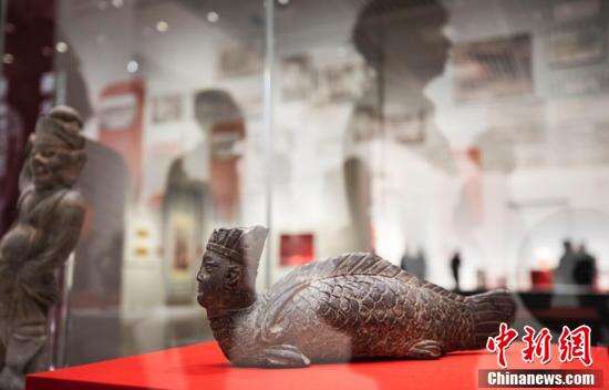 图为展陈的1950年出土于江苏江宁南唐二陵的南唐时期人首鱼身俑。