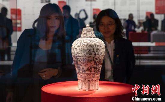 图为展出的1957年出土于江苏江宁东善桥响龙山的明代洪武年间釉里红岁寒三友纹梅瓶。