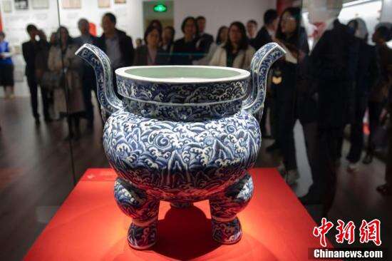 图为展陈的明代永乐年间青花寿山福海纹香炉。