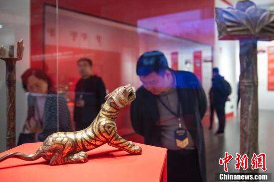 11月6日,南京博物院迎来建院90周年之际,“九十年春华秋实——南京博物院的珍藏”特展揭开面纱,带来一场精彩的文博盛宴。本次展览以南京博物院90年院史为主线,以40余万件文物收藏史为纲,釉里红岁寒三友纹梅瓶、景德镇官窑青花万寿纹瓷尊等数百件罕见的“国宝天团”集中亮相。图为展出的2011年出土于江苏盱眙大云山江都王陵的错金铜虎。