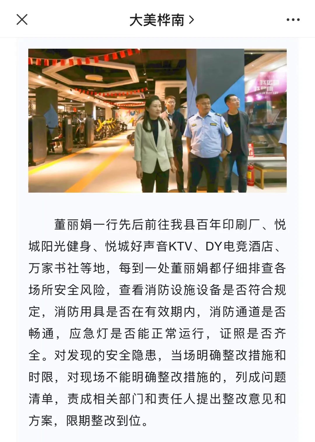 桦南县官方微信公众号“大美桦南”报道显示,事发两个月前,2023年9月5日下午,桦南县委常委董丽娟曾带队检查文化娱乐市场安全生产工作,悦城阳光健身、悦城好声音KTV就属检查地点之一。