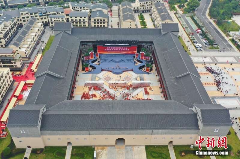 航拍世界客家民俗文化城内的世界客家非物质文化遗产馆。(无人机照片)