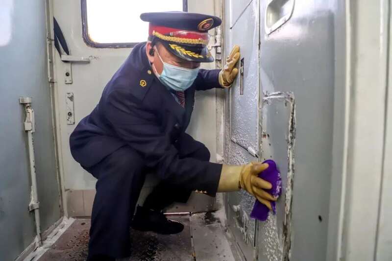 在乌伊岭开往佳木斯的6274次“红松故乡号”列车上,乘务员冒着刺骨寒风一遍遍清理车门、翻板、车厢连接处和乘降梯的积雪,避免旅客滑倒摔伤,确保旅客安全乘降。
