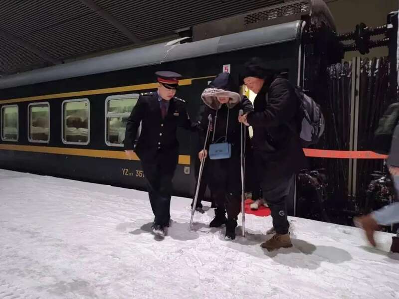 11月7日23时,Z113次列车抵达哈尔滨西站。值乘近30个小时的乘务员耐心搀扶重点旅客下车,确保每一位旅客安全抵达目的地。