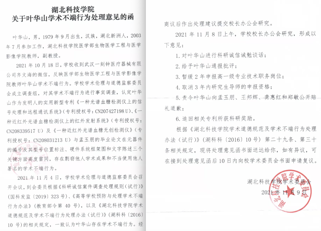 据澎湃新闻此前报道,2021年11月9日,湖北科技学院学术委员会在内部公布了《湖北科技学院关于叶华山学术不端行为处理意见的函》,其中显示:
