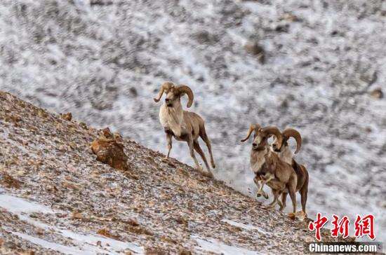 近期,在高原“野生动物乐园”三江源国家公园的黄河源园区,各种野生动物,或在雪地里踏雪而行,或在枯黄草地内觅食张望,颇显生机。三江源国家公园位于青海省西南部,是世界海拔最高、中国面积最大的国家公园。图为盘羊在雪地内驻足。