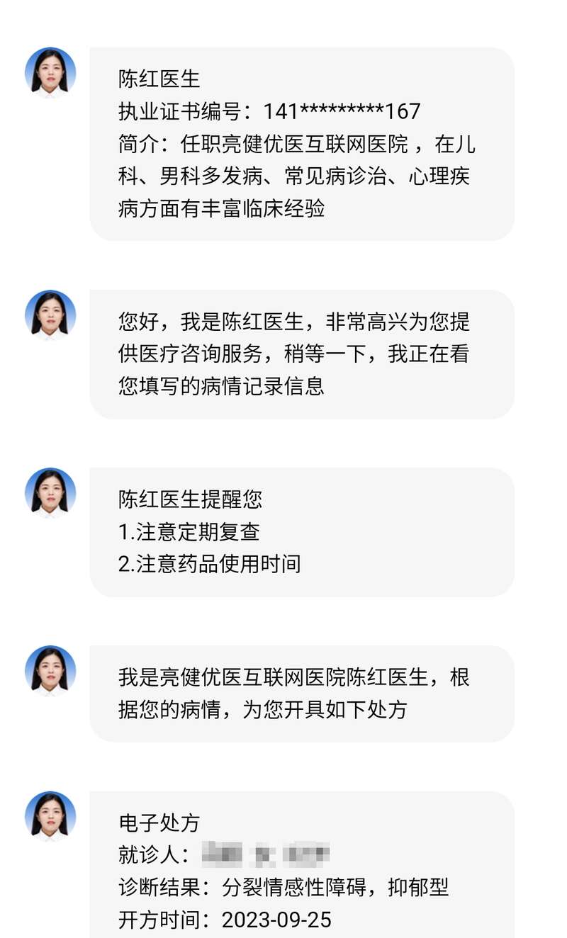 不仅是问诊环节存在问题,开处方环节也有漏洞。记者发现,一家名为“亮健好药网”的企业,在销售抗抑郁类药物“米氮平”“百忧解”等药物时,其他平台都需要上传处方照片进行审核,而记者多次上传不同样式的风景照,每次都会跳出来一位“亮健优医互联网医院陈红医生”接诊,根据介绍,她在儿科、男科多发病、常见病诊治、心理疾病方面有丰富临床经验。根据记者上传的风景照,陈医生瞬间开具了电子处方,并进入了药师审核阶段。随后记者取消订单,并在不同时间,多次尝试上传风景照,发现每次都是这位陈红医生瞬间开方。虽然后续亮健平台药师都会致电记者要求补充处方才能开药,但这位陈红医生却总能第一时间看着风景照“秒开处方”。