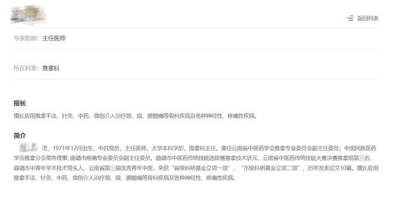 而在曲靖中医医院官网上,张树昆医生的简介为:推拿科主任医师,擅长应用推拿手法、针灸、中药、微创介入治疗肩、颈、腰腿等骨科疾病及各种神经性、疼痛性疾病。