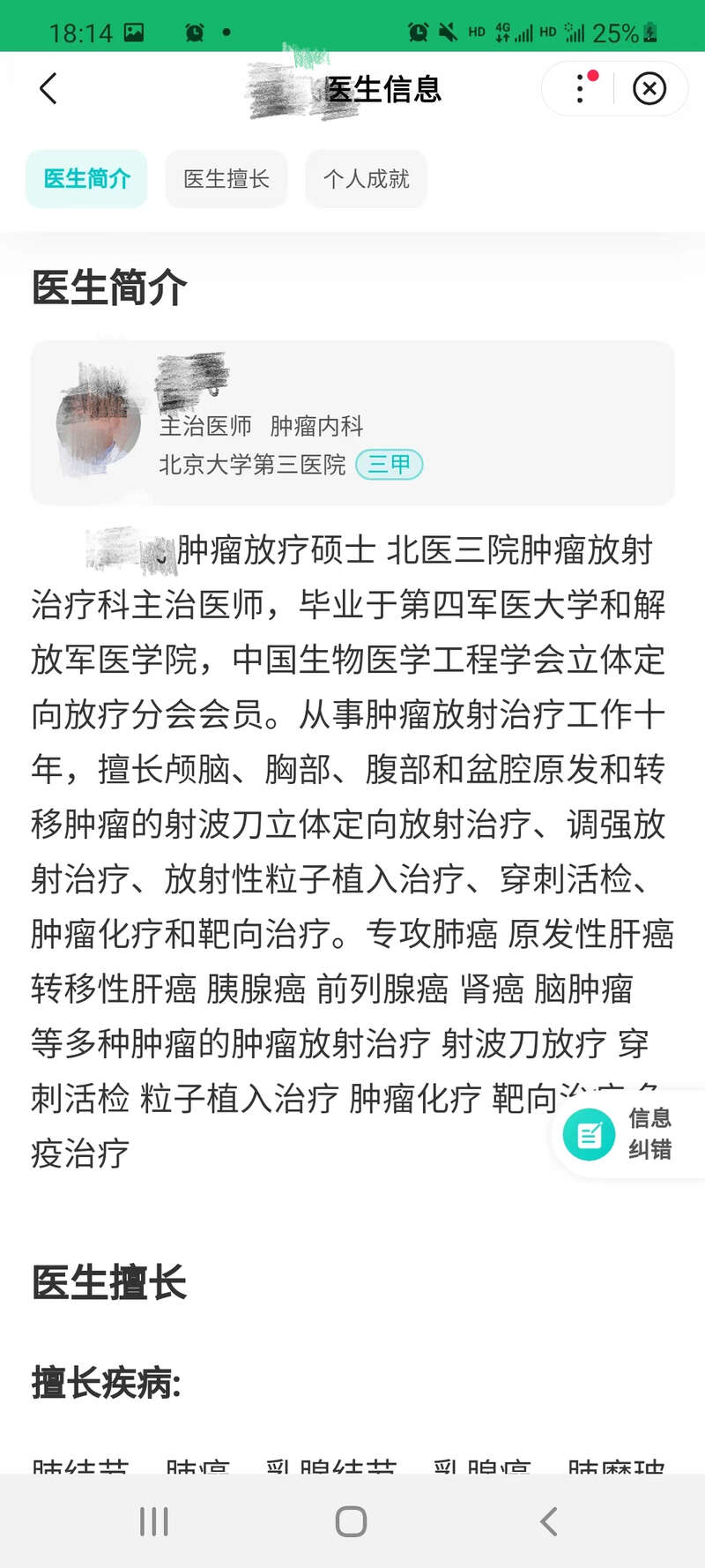 吴先生发给记者的百度健康页面上显示:这位医生是肿瘤内科的主治医师,但其个人介绍里又写着他是肿瘤放疗科主治医师,放疗科医生的执业证书和内科不同,吴先生也对平台提出过质疑,医生到底是哪个科的?是否专业?