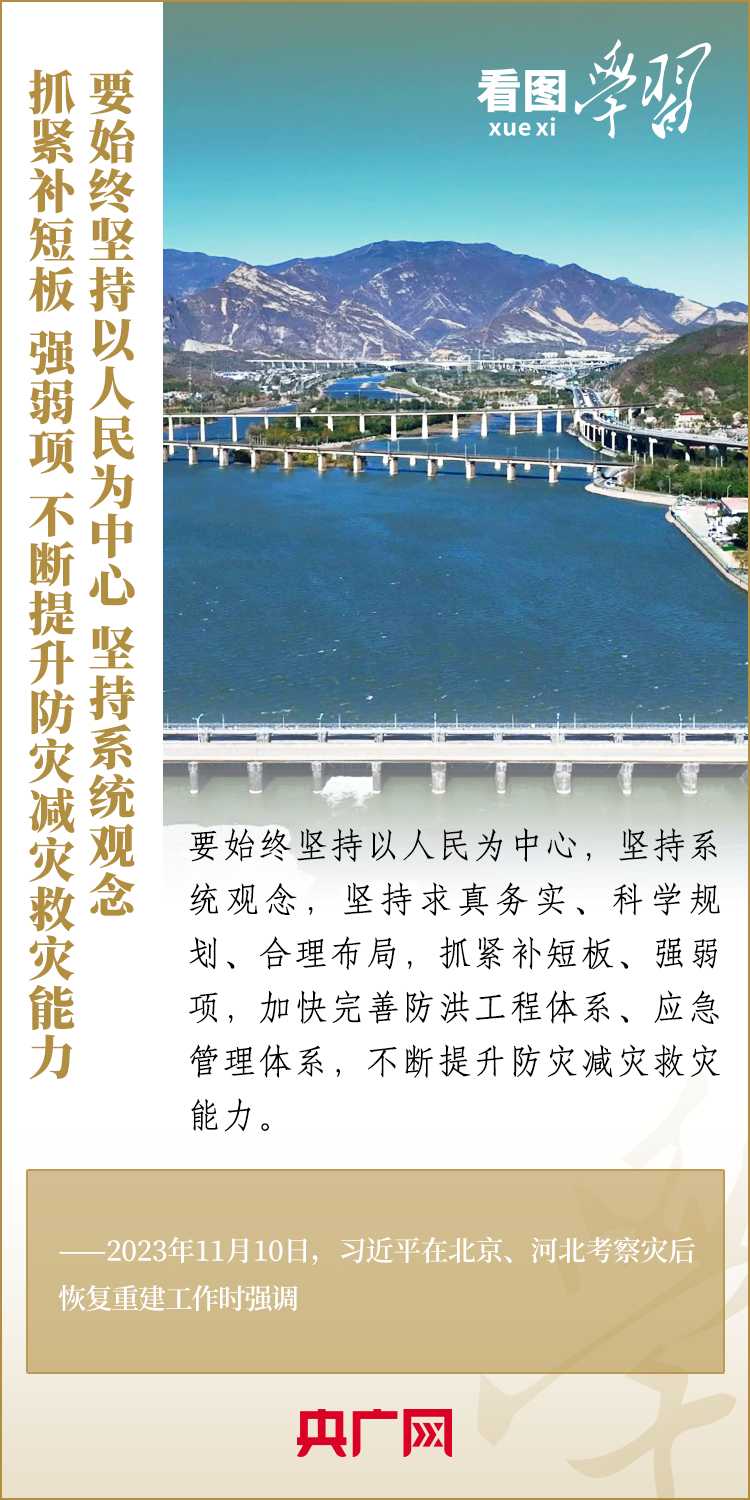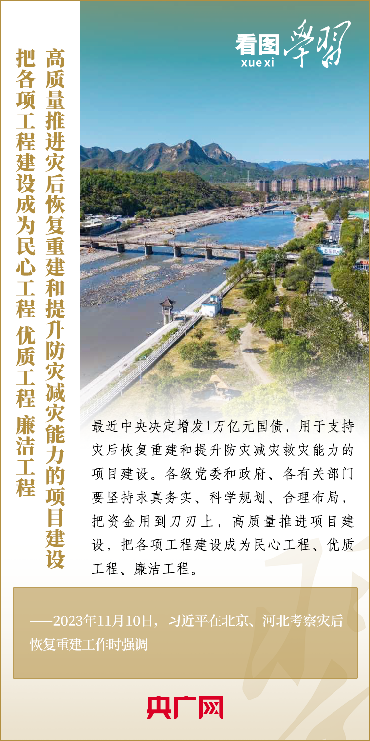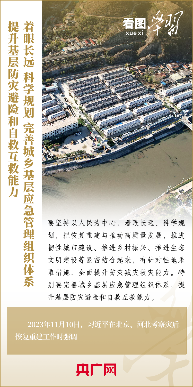 11月10日,习近平总书记在北京、河北考察灾后恢复重建工作。总书记深入学校、社区、村庄、水利工程工地,实地察看村容村貌,了解基础设施恢复建设提升等情况,要求有关部门坚持以人民为中心,坚持系统观念,着眼长远、科学规划,把恢复重建与推动高质量发展、推进韧性城市建设、推进乡村振兴、推进生态文明建设等紧密结合起来,有针对性地采取措施,再接再厉抓好灾后恢复重建,确保广大人民群众安居乐业、温暖过冬。