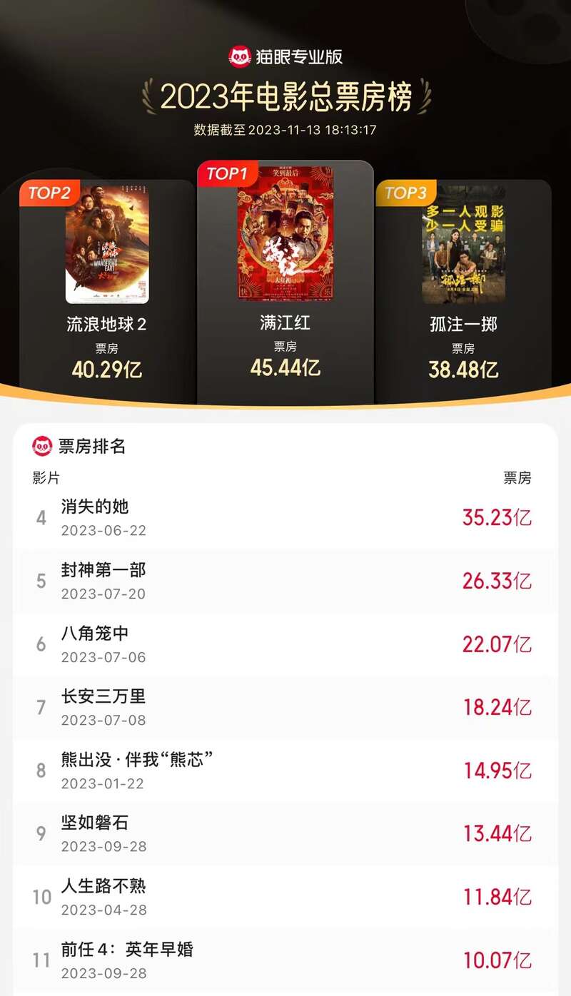 2023年全年票房中,国产电影票房占比达83.4%,其中年度票房前十一均为国产片,分别是《满江红》《流浪地球2》《孤注一掷》《消失的她》《封神第一部》《八角笼中》《长安三万里》《熊出没·伴我“熊芯”》《坚如磐石》《人生路不熟》《前任4:英年早婚》。截至目前,2023年已有55部影片票房过亿元,其中国产片37部。
