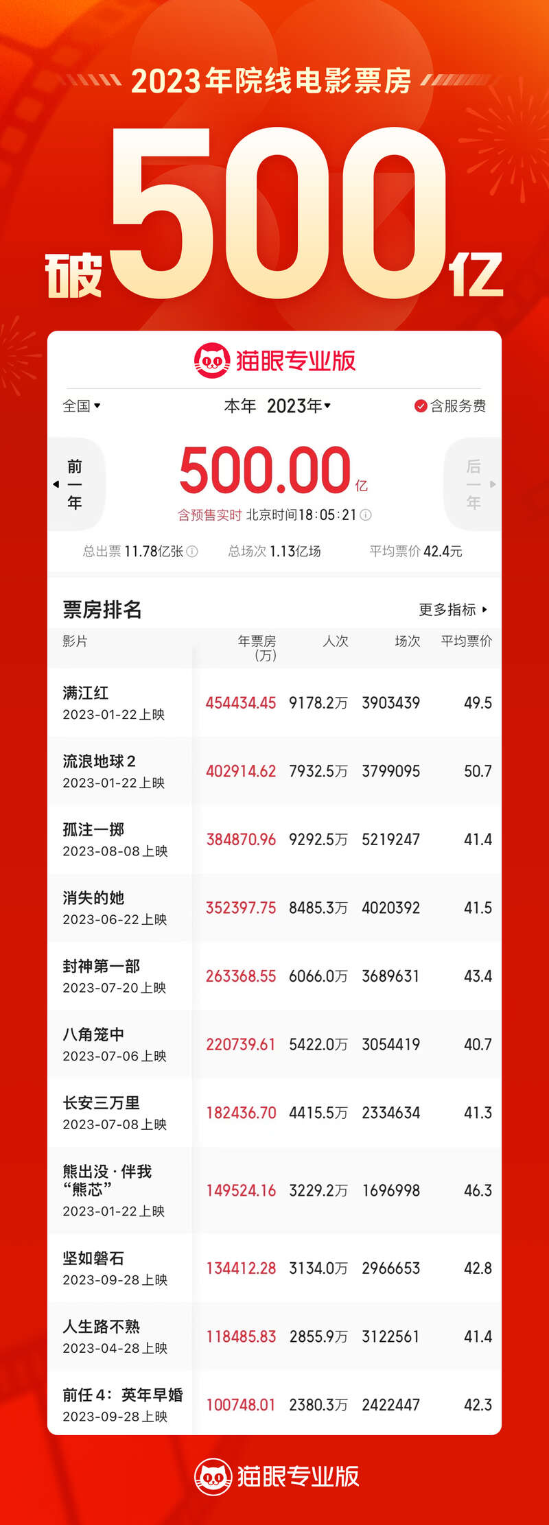 数据显示,今年电影票房突破500亿元用时317天,超过2017年(324天),仅次于2018年(277天)和2019年(276天)。今年电影市场观影总人次达11.78亿,总场次1.13亿场,平均票价42.4元。